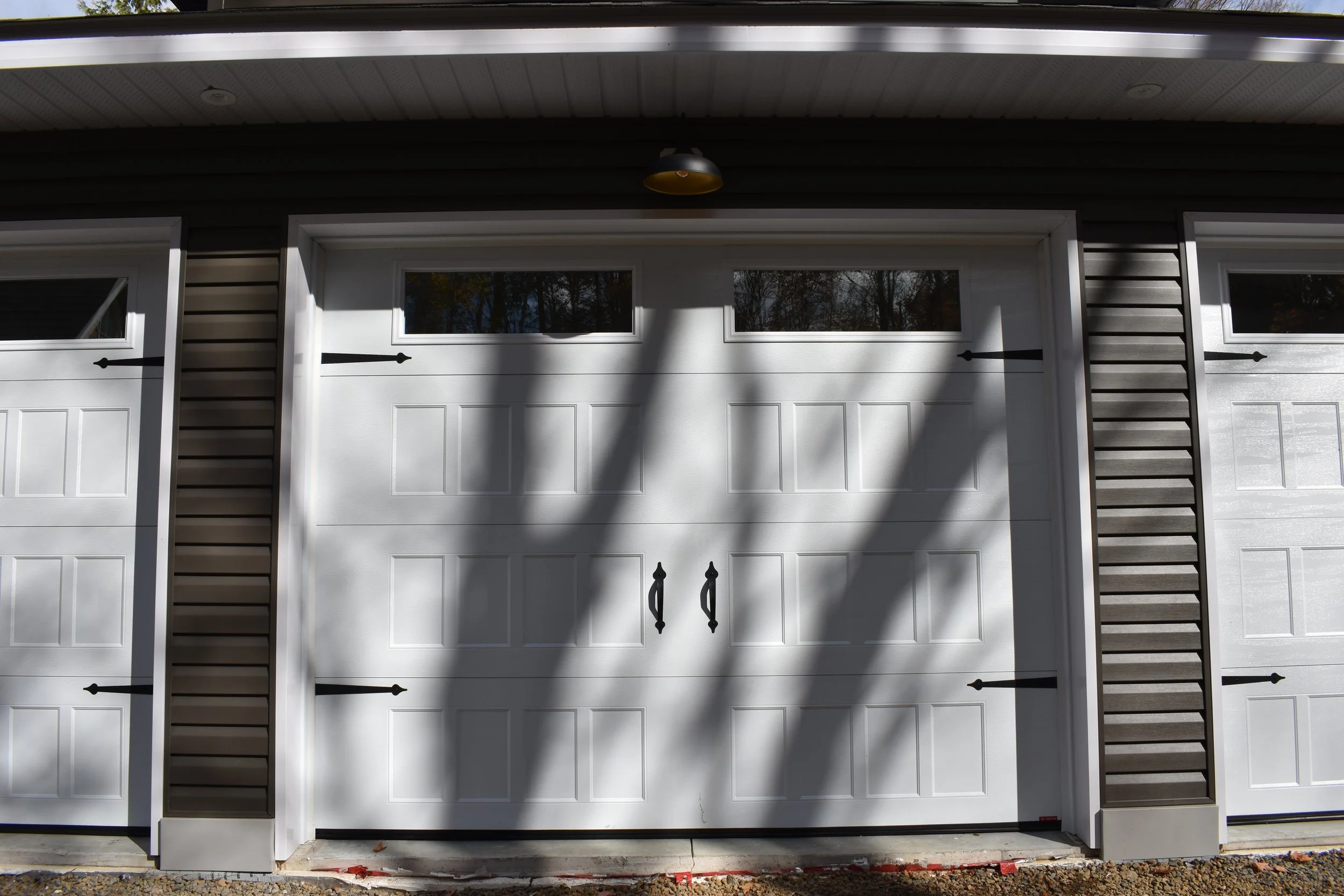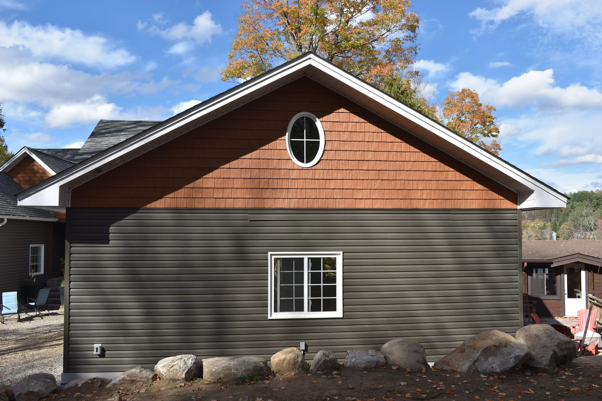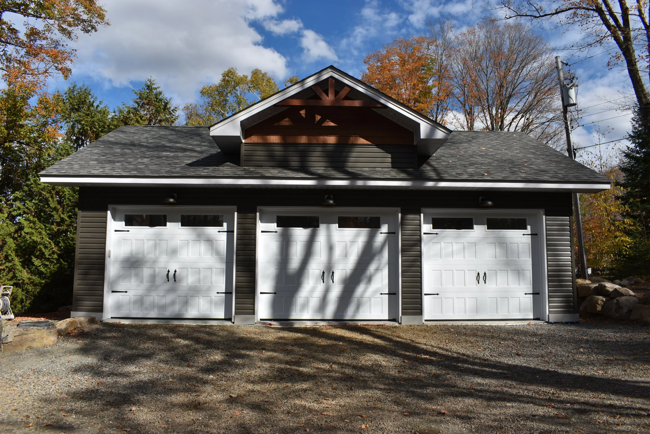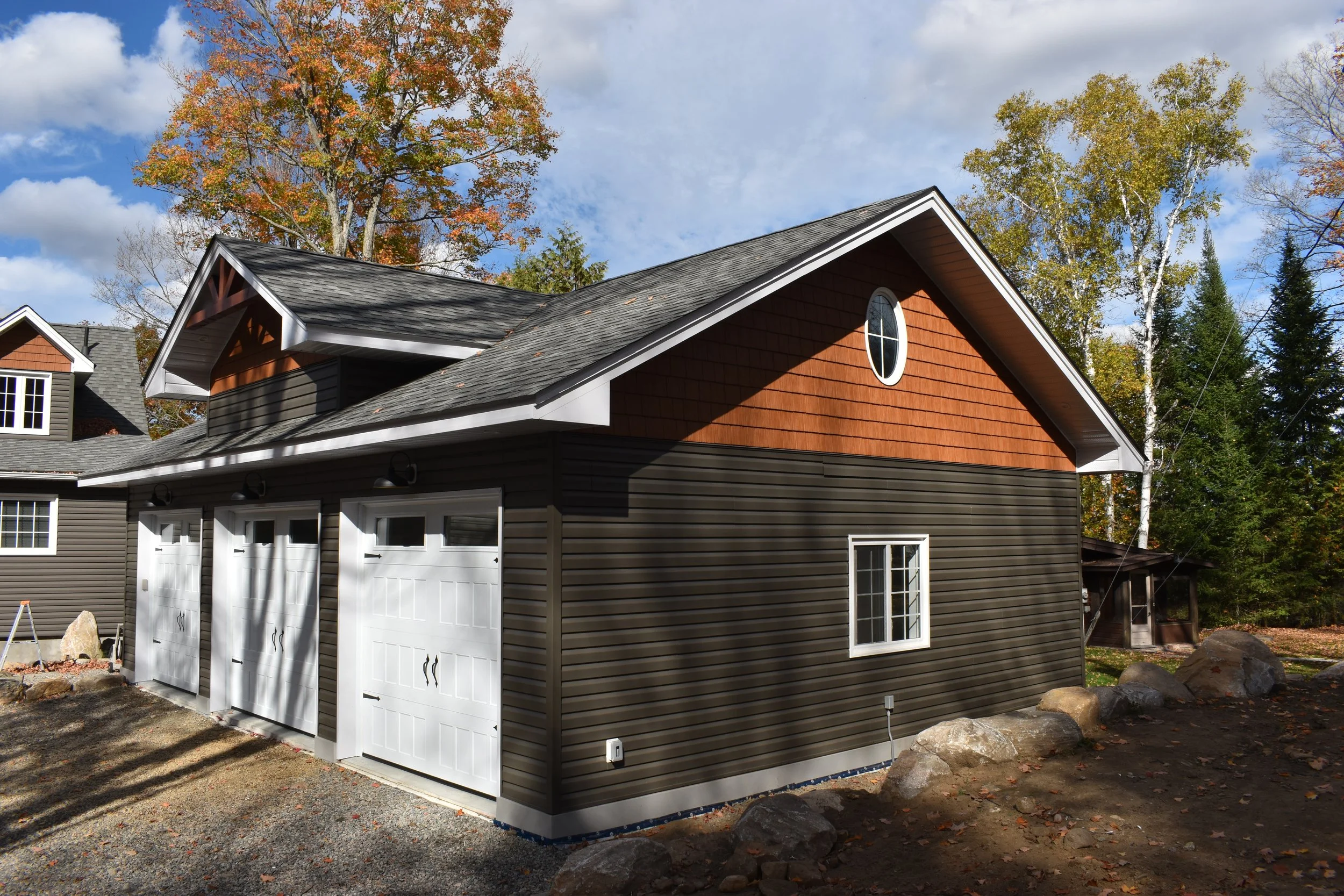 This custom-built, three-car garage is a perfect example of craftsmanship meeting functionality. Designed with both aesthetic appeal and practical use in mind, the structure features classic carriage-style doors with upper windows for natural light, decorative black hardware, and three individual bays to offer ample space for vehicles, storage, or a workshop. The exterior is a pleasing contrast of rich brown cedar shake-style vinyl siding in the gables, and dark vinyl siding on the lower sections, which blend seamlessly with the property's landscape. The exposed timber truss under the front gable is a standout architectural detail that adds a rustic touch. The gable ends are accented with a charming oval window above a functional, double-pane sliding Vinyl Built brand window; letting in plenty of natural light while maintaining energy efficiency. Built to withstand the seasons, with functionality and effective use of space, this garage is more than just storage—it's a statement of quality and thoughtful design. Built to last and designed to impress.