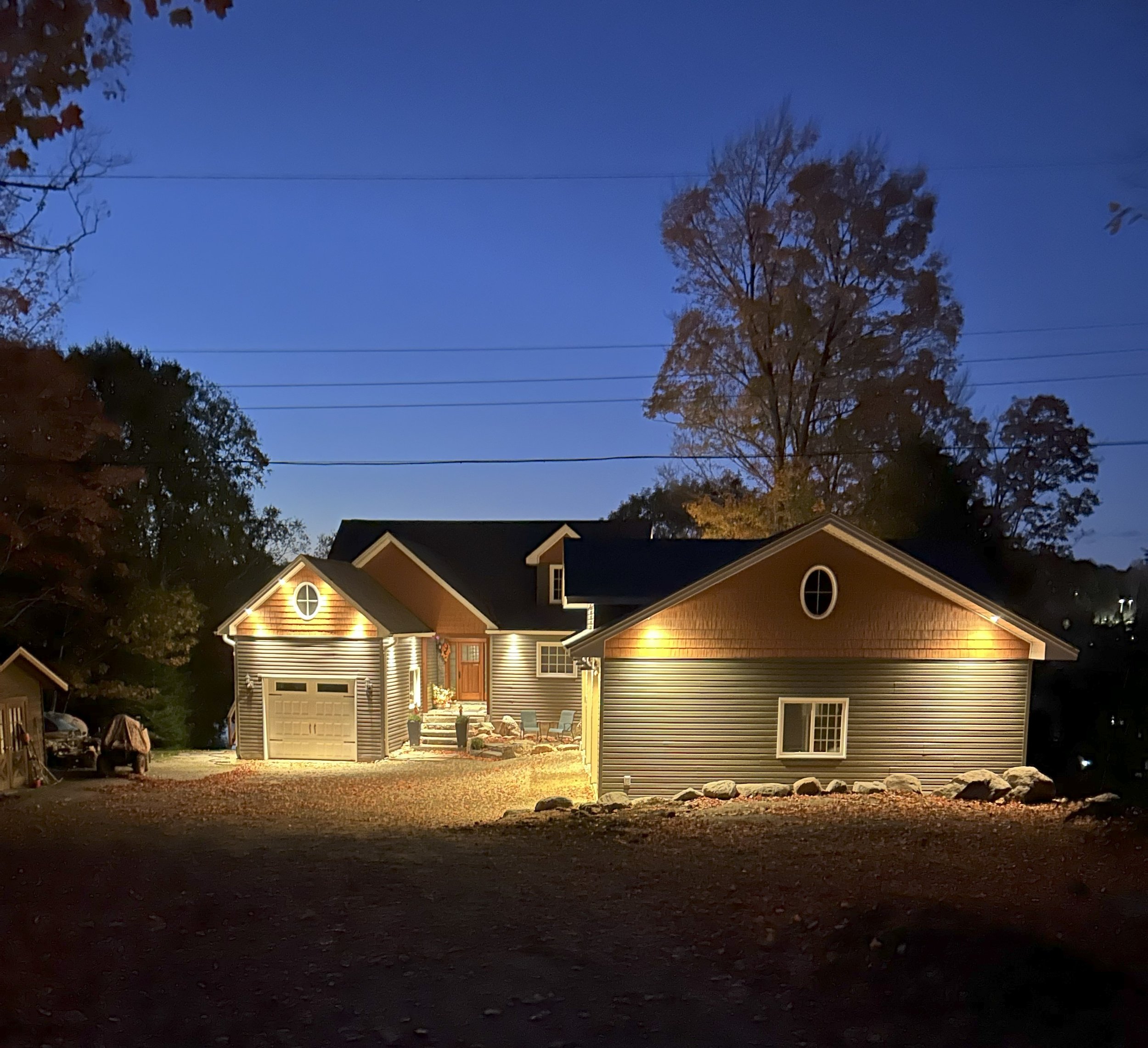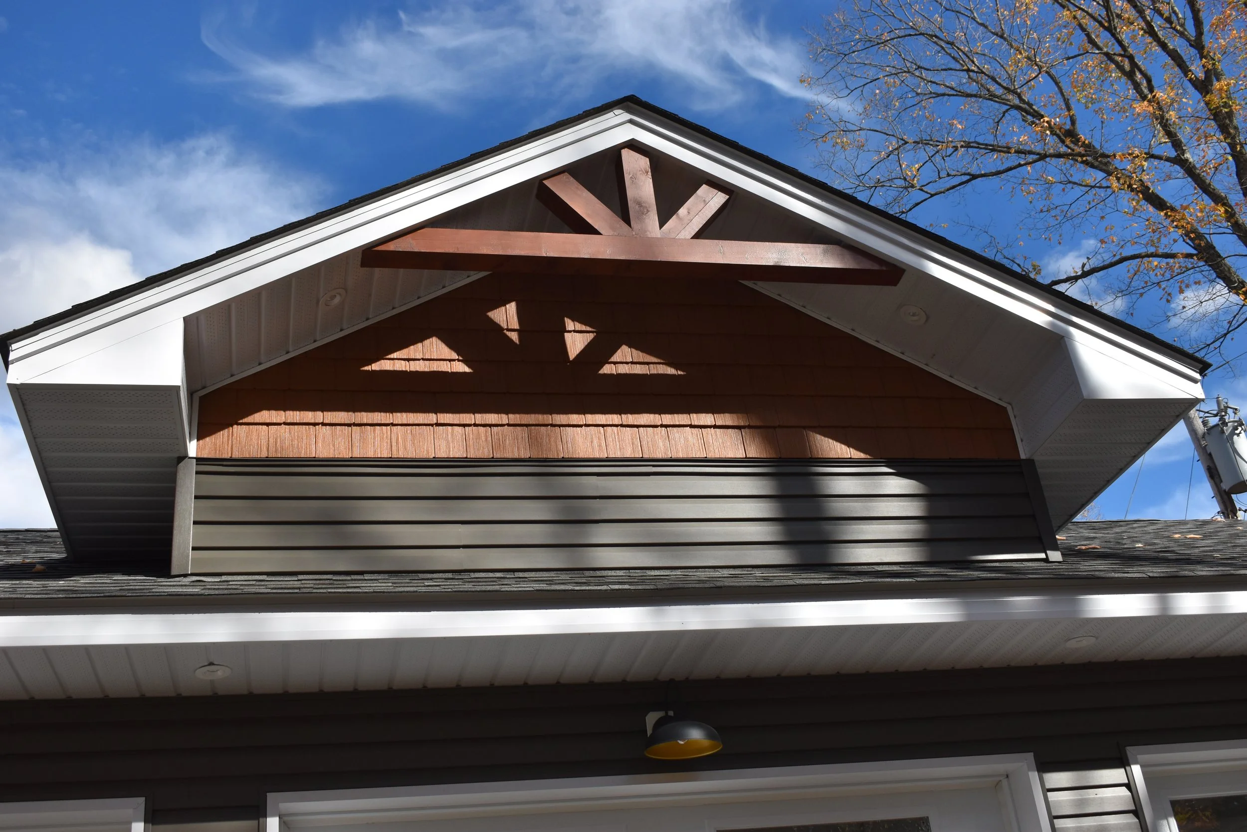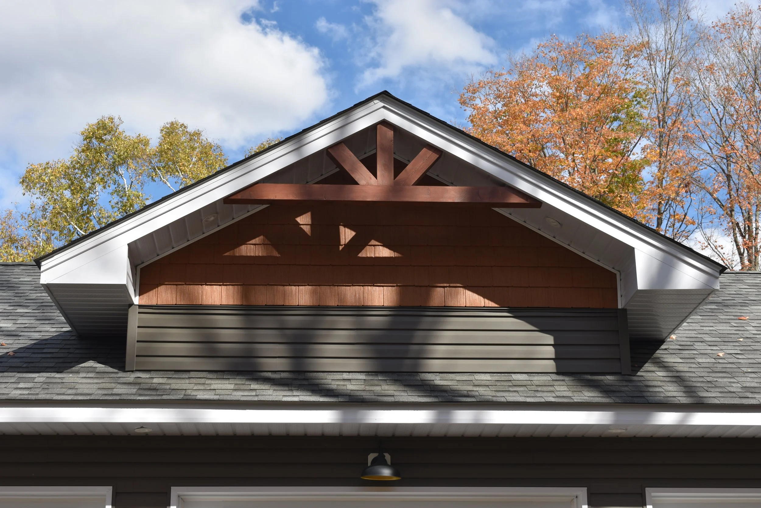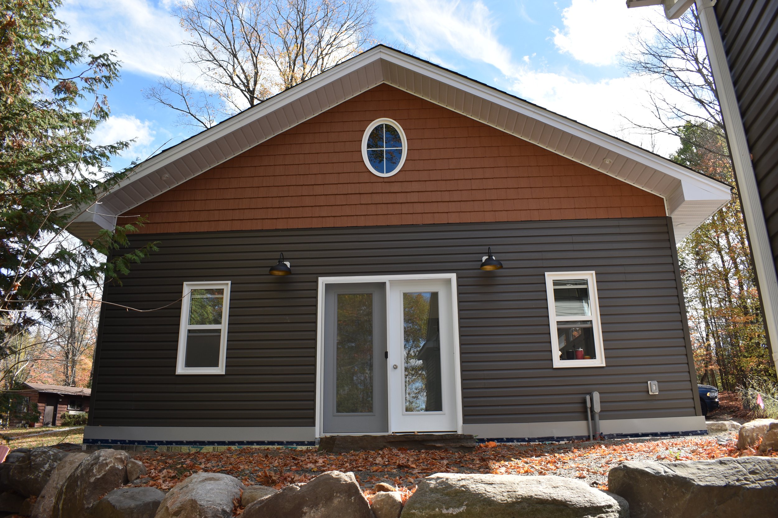 This custom-built, three-car garage is a perfect example of craftsmanship meeting functionality. Designed with both aesthetic appeal and practical use in mind, the structure features classic carriage-style doors with upper windows for natural light, decorative black hardware, and three individual bays to offer ample space for vehicles, storage, or a workshop. The exterior is a pleasing contrast of rich brown cedar shake-style vinyl siding in the gables, and dark vinyl siding on the lower sections, which blend seamlessly with the property's landscape. The exposed timber truss under the front gable is a standout architectural detail that adds a rustic touch. The gable ends are accented with a charming oval window above a functional, double-pane sliding Vinyl Built brand window; letting in plenty of natural light while maintaining energy efficiency. Built to withstand the seasons, with functionality and effective use of space, this garage is more than just storage—it's a statement of quality and thoughtful design. Built to last and designed to impress.